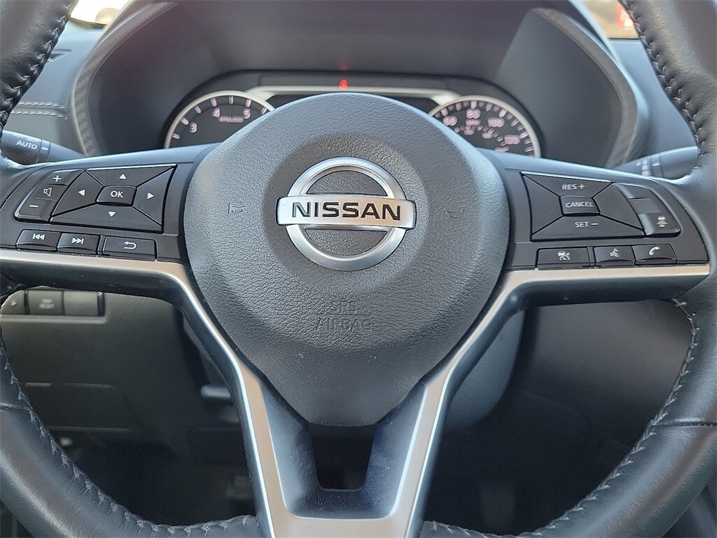 The upscale details carry over into our SV cabin with our All Weather Pack, which adds heated premium-cloth front seats, a heated leather steering wheel, dual-zone automatic climate control, and remote start to complement Nissan's Intelligent Key with pushbutton ignition. A 7-inch driver display and an 8-inch touchscreen dominate the dash and support Apple CarPlay®, Android Auto®, voice recognition, Bluetooth®, and a six-speaker audio system with SiriusXM compatibility.