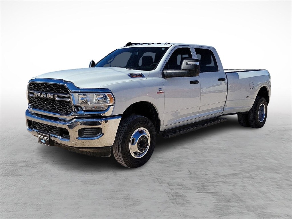 Our Diesel-driven One Owner and Clean Carfax 2024 RAM 3500 Tradesman Crew Cab 4X4 with the Level 2 and Chrome Packs is hungry for hard work in Bright White! Powered by a TurboCharged 6.7 Liter Cummins Diesel 6 Cylinder offering 370hp and 850lb-ft of torque to a 6 Speed Aisin Automatic transmission for heavy-duty applications. This Four Wheel Drive truck also features an anti-spin rear differential to deliver enhanced traction, and its bold design is backed by intelligent functionality. Check out the chrome grille, quad headlamps, an LED hitch lamp, a Class V hitch receiver, and our Level 2 Pack for heated power trailer mirrors with built-in running lamps.